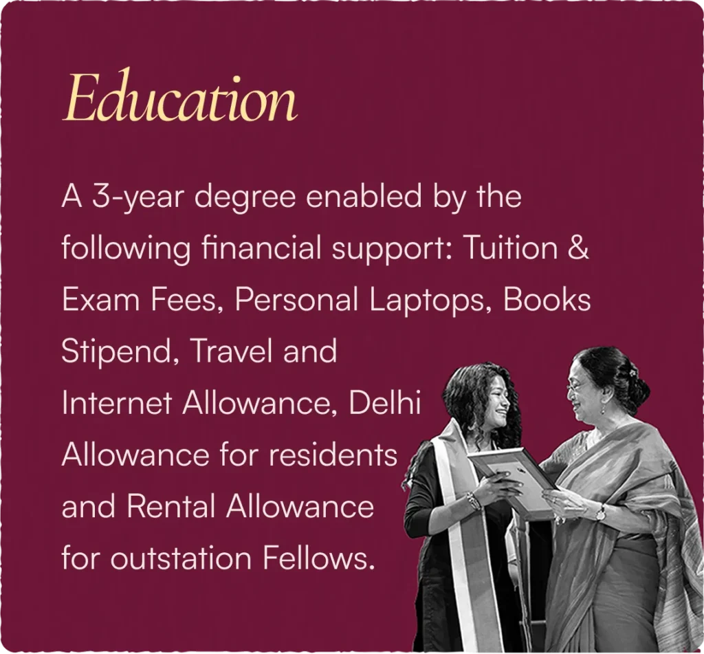 A 3-year degree enabled by the following financial support: Tuition & Exam Fees, Personal Laptops, Books Stipend, Travel and Internet Allowance, Delhi Allowance for residents and Rental Allowance for outstation Fellows.