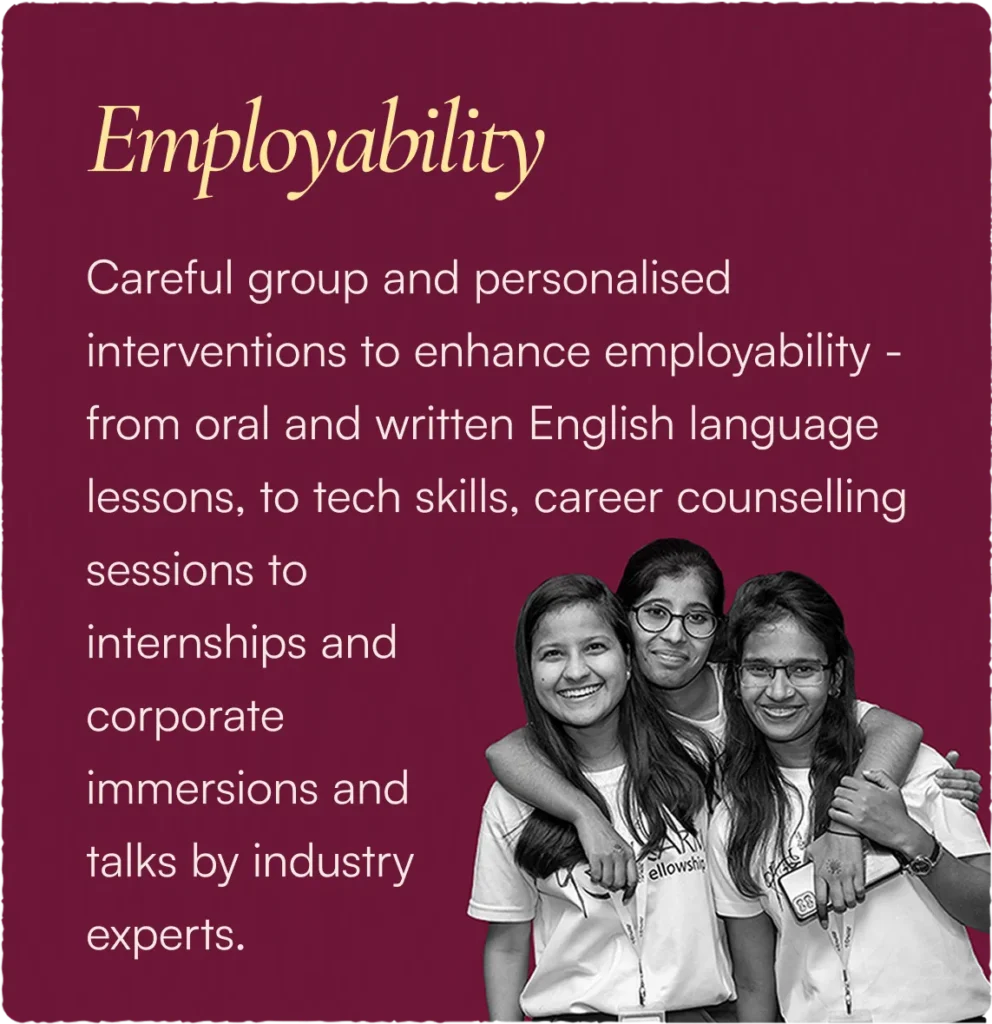 Careful group and personalised interventions to enhance employability – from oral and written English language lessons, to tech skills, career counselling sessions to internships and corporate immersions and talks by industry experts.