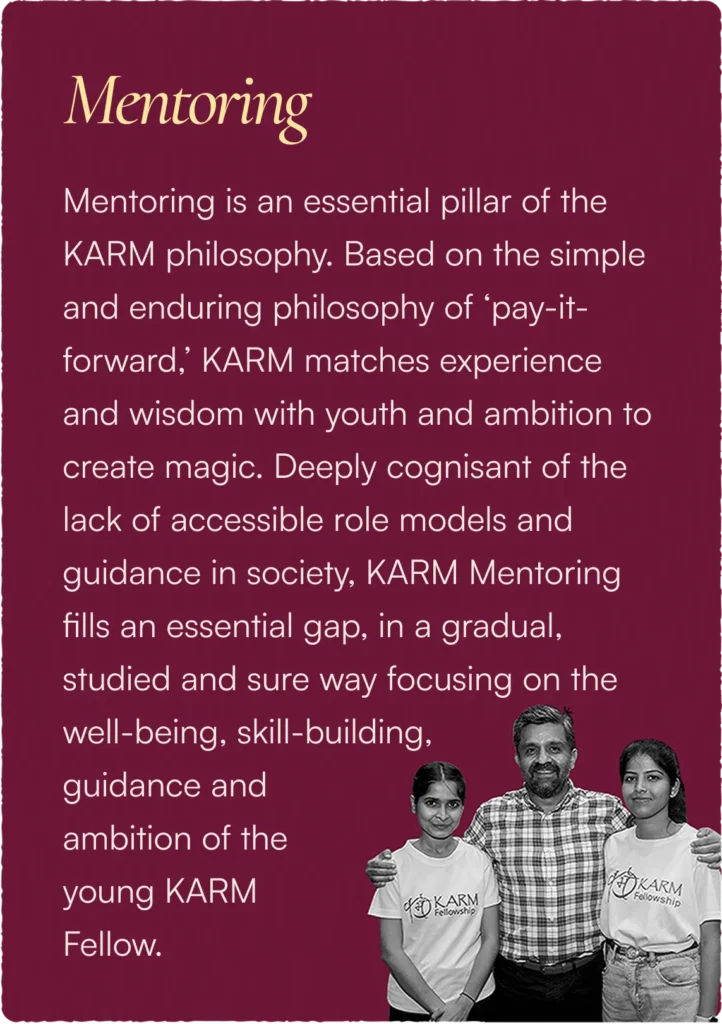 Mentoring is an essential pillar of the KARM philosophy. Based on the simple and enduring philosophy of ‘pay-it-forward,’ KARM matches experience and wisdom with youth and ambition to create magic. Deeply cognisant of the lack of accessible role models and guidance in society, KARM Mentoring fills an essential gap, in a gradual, studied and sure way focusing on the well-being, skill-building, guidance and ambition of the young KARM Fellow.